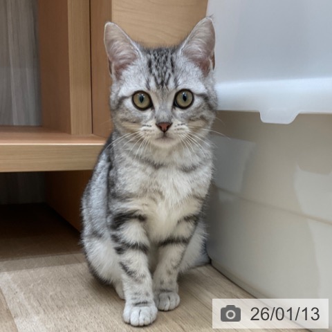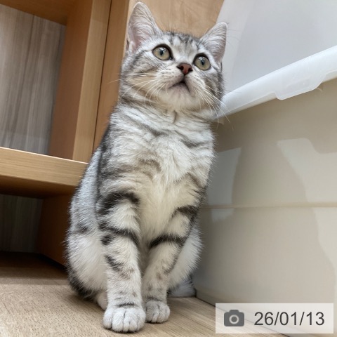 アメリカンショートヘアーの子猫詳細情報長野県/2025年9月25日生まれ/男の子/シルバータビーの子猫