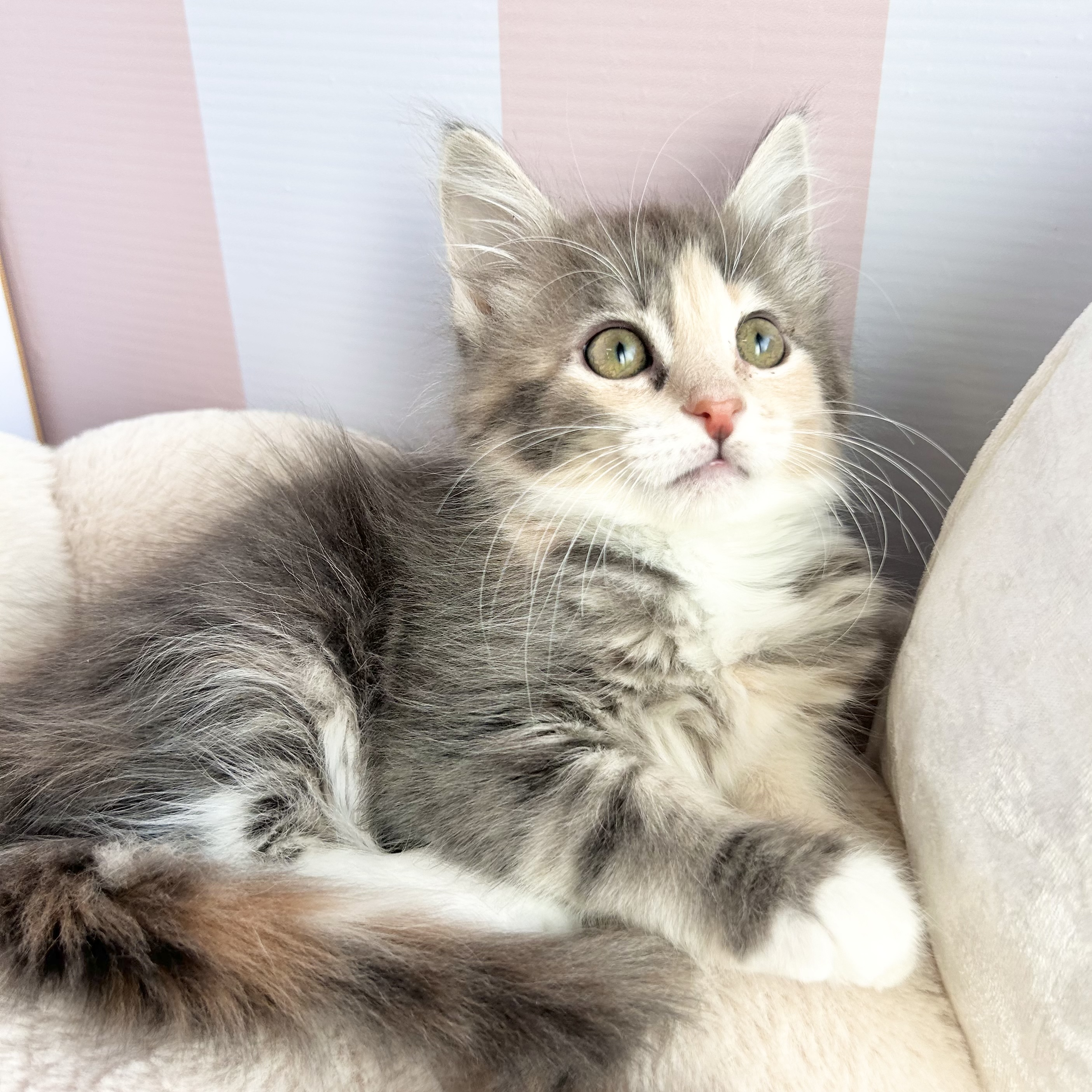 メインクーンの子猫詳細情報岡山県/2025年10月11日生まれ/女の子/ブルーパッチドタビーホワイトの子猫