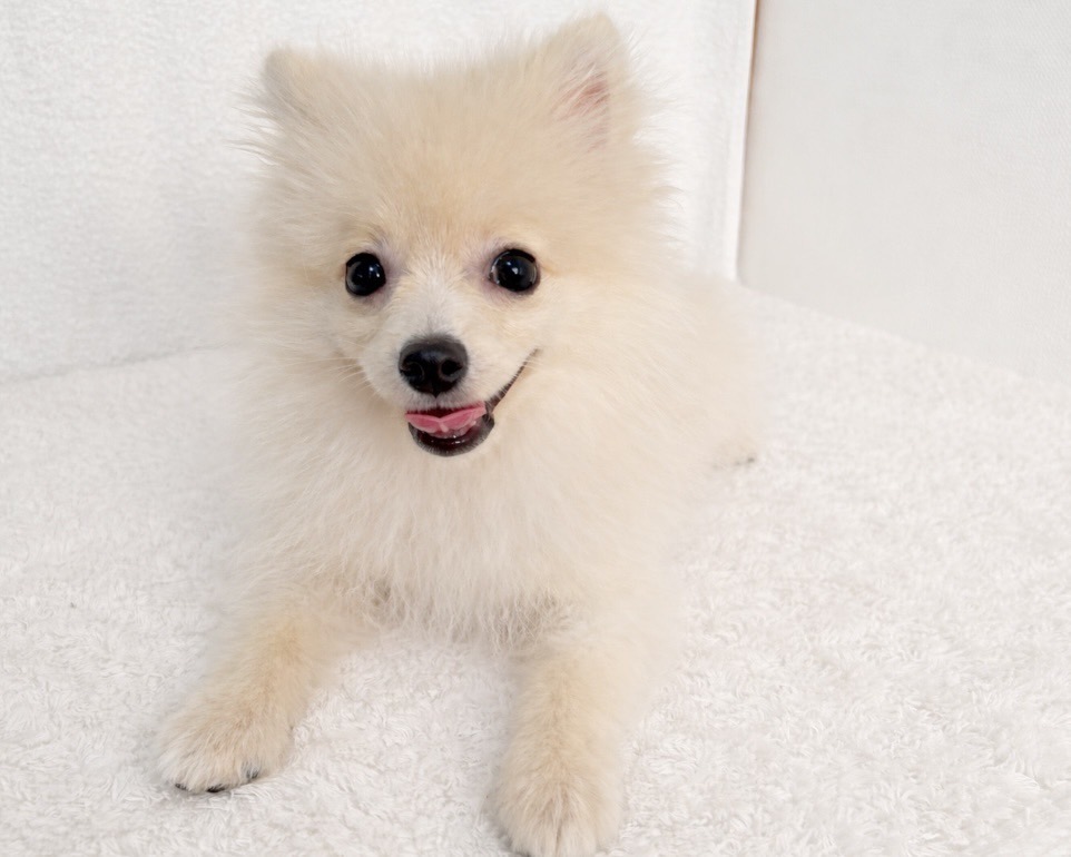 ふわふわのクリームカラーがとても美しい、小さな小さなポメラニアンの男の子です。まるでぬいぐるみのような柔らかいフォルムと大きなうるうるおめめが特徴で、初対面の方でも思わず抱きしめたくなる可愛さです。