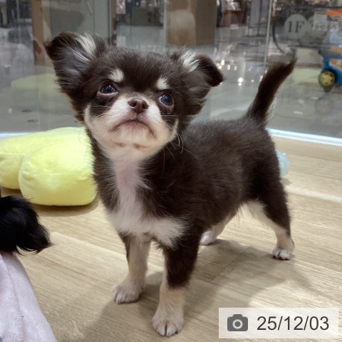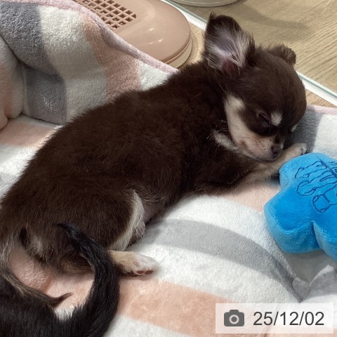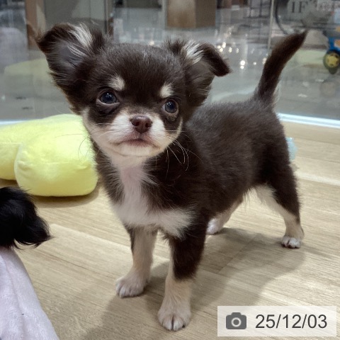 チワワ(ロング)の子犬詳細情報埼玉県/2025年9月27日生まれ/男の子/チョコレートタンホワイトの子犬