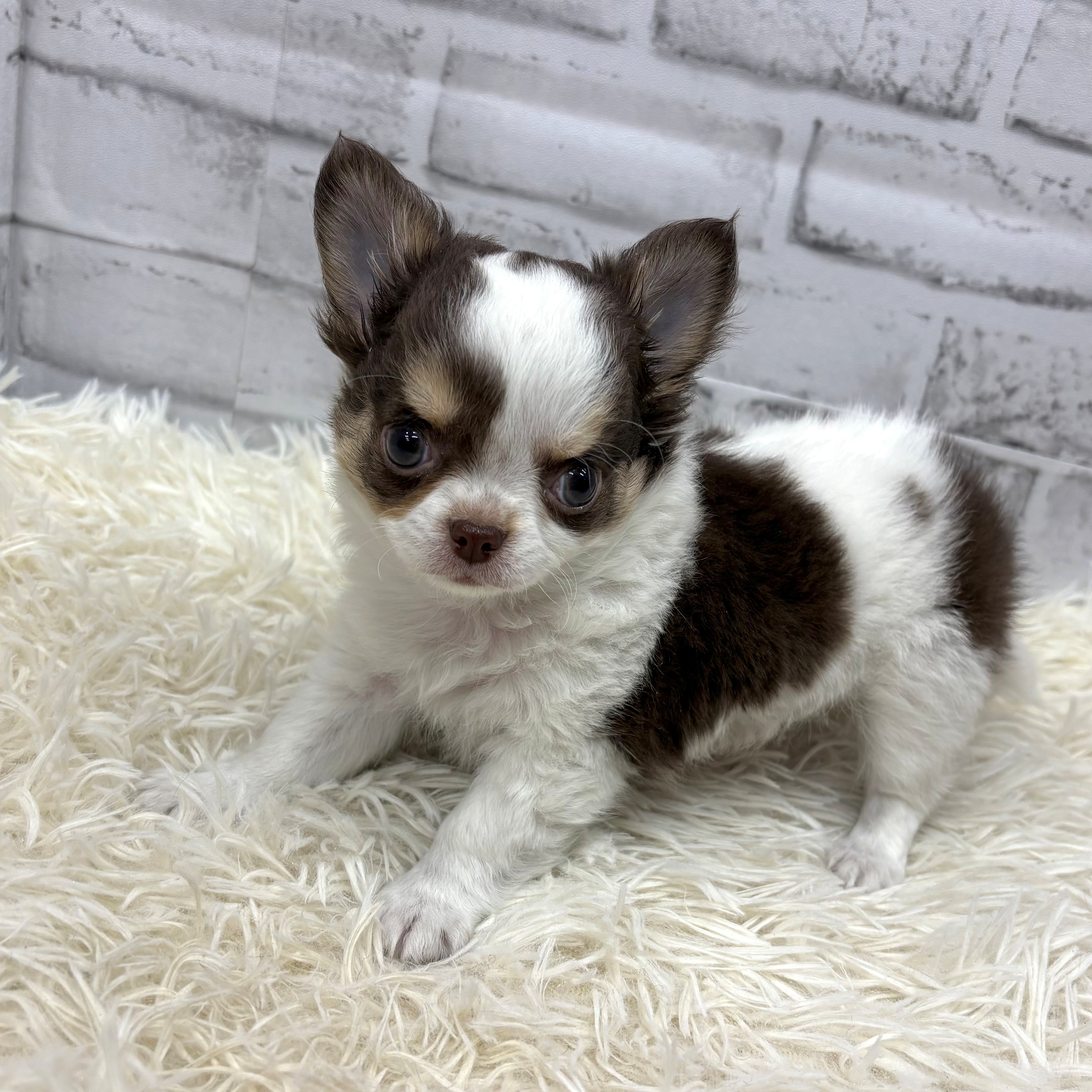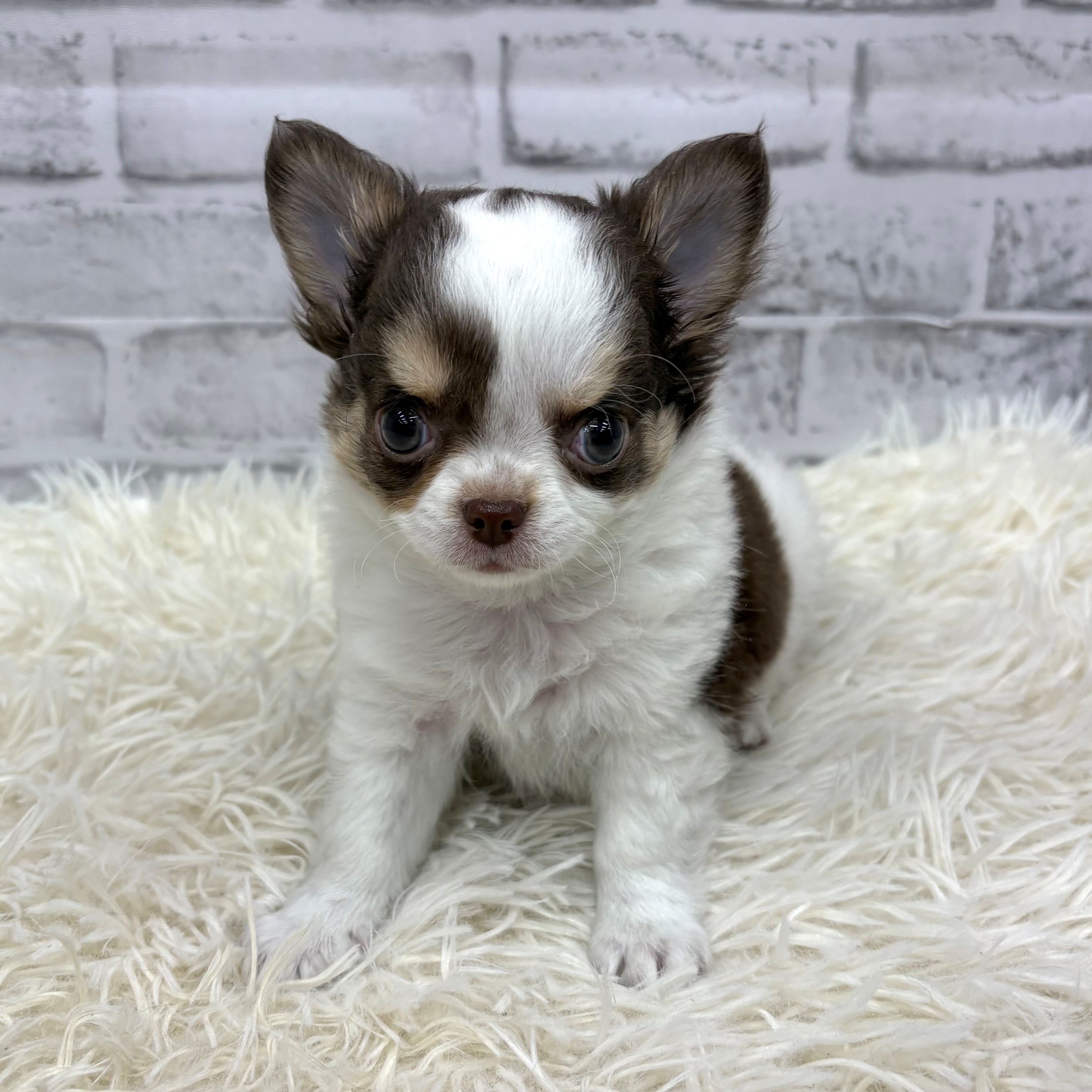 チワワ(ロング)の子犬詳細情報愛知県/2025年12月14日生まれ/男の子/ホワイト、チョコレート&タンの子犬