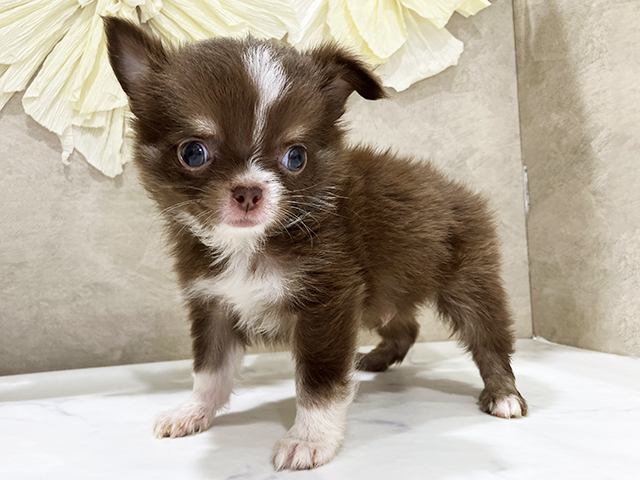 チワワ(ロング)の子犬詳細情報兵庫県/2025年8月11日生まれ/男の子/チョコレートタンホワイトの子犬