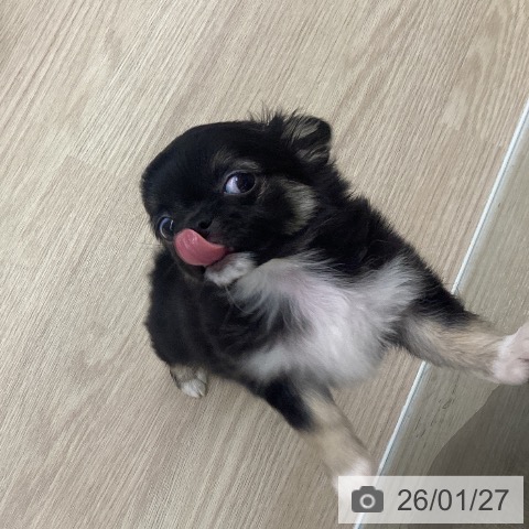 チワワ(ロング)の子犬詳細情報長崎県/2025年11月14日生まれ/男の子/ブラックタンホワイトの子犬