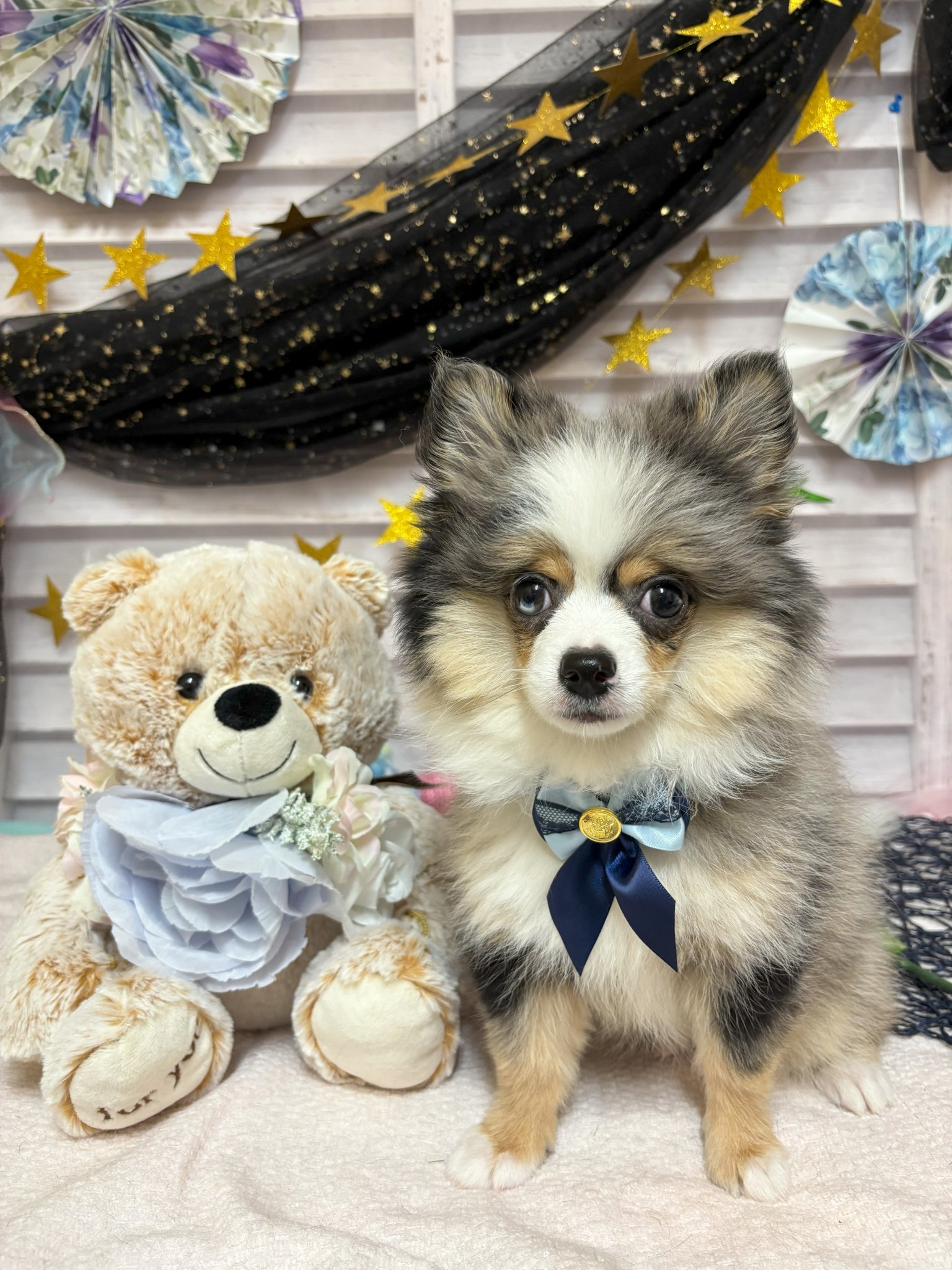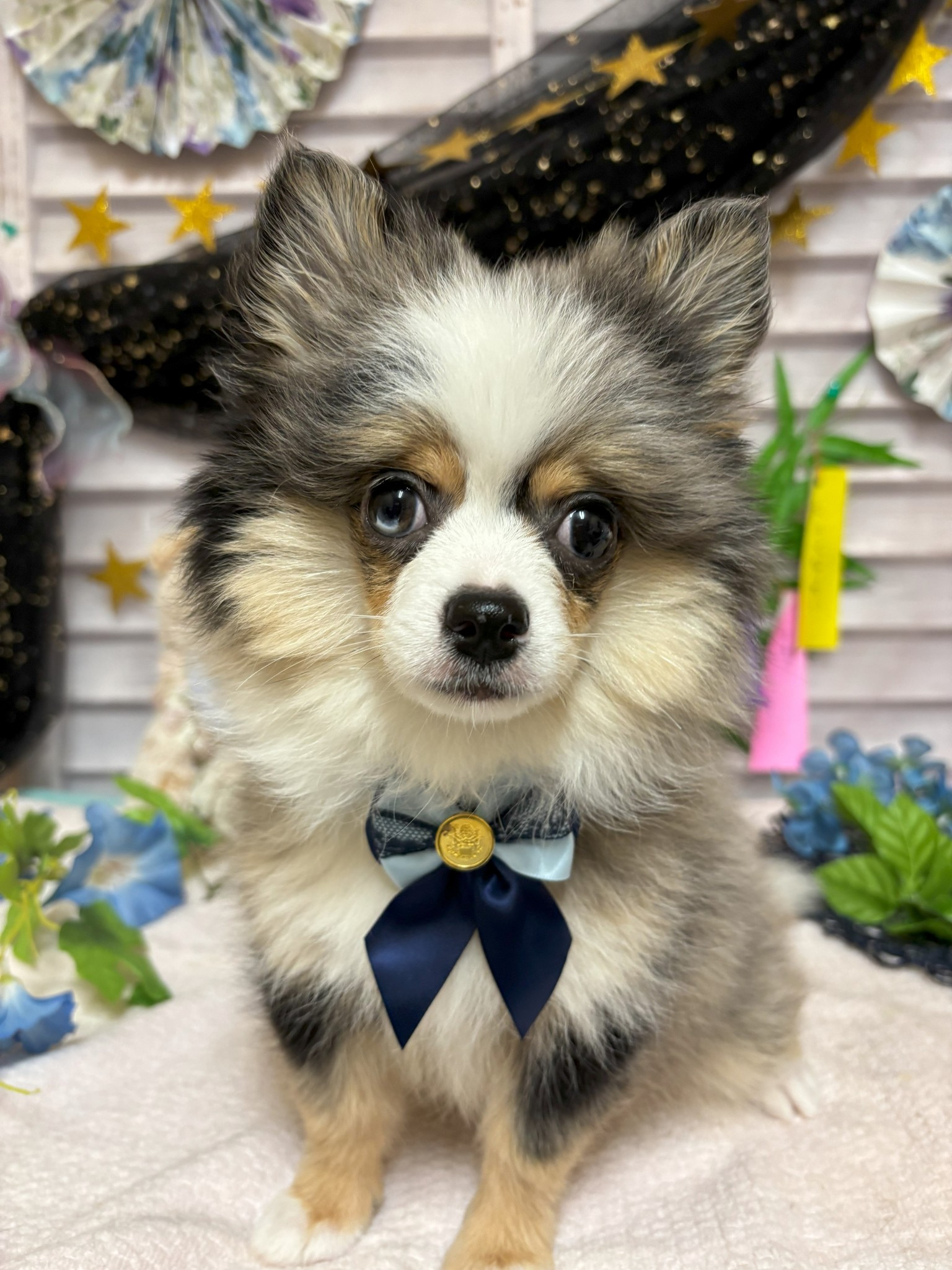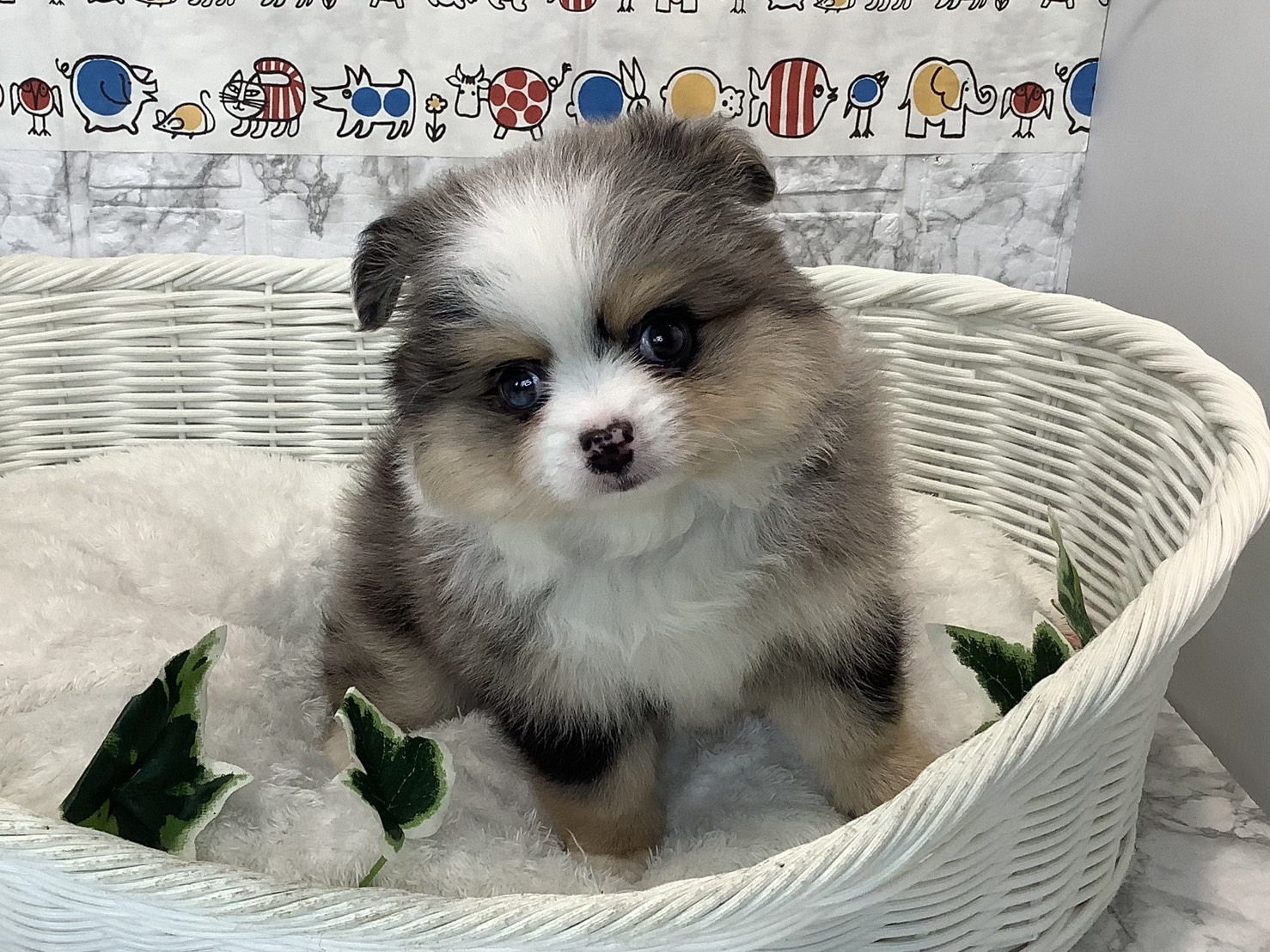 ご覧いただきありがとうございます。チワワとポメのハーフです少し青の入った珍しいおめめしてます😊✨マーブルの毛色でふわもこのかわいい男の子です💙ぴょこぴょこ遊んでる姿がたまらないです!!是非抱っこしにご来店下さい🐶💕 お問い合わせお待ちしております。10/16 体重3.1kg