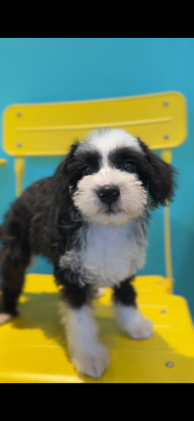 シュナウザーの優しい表情と、プードルの愛らしいくるくる毛並みが合わさったハイブリッドくんです🥺
